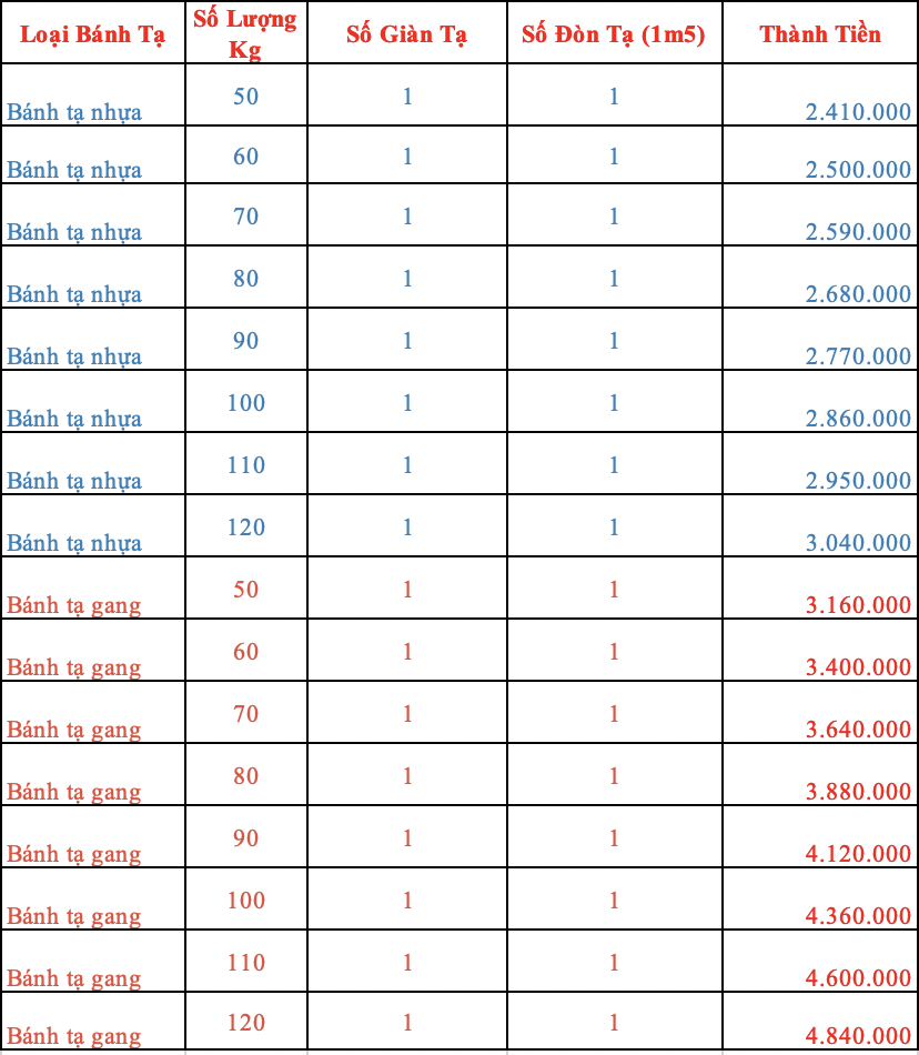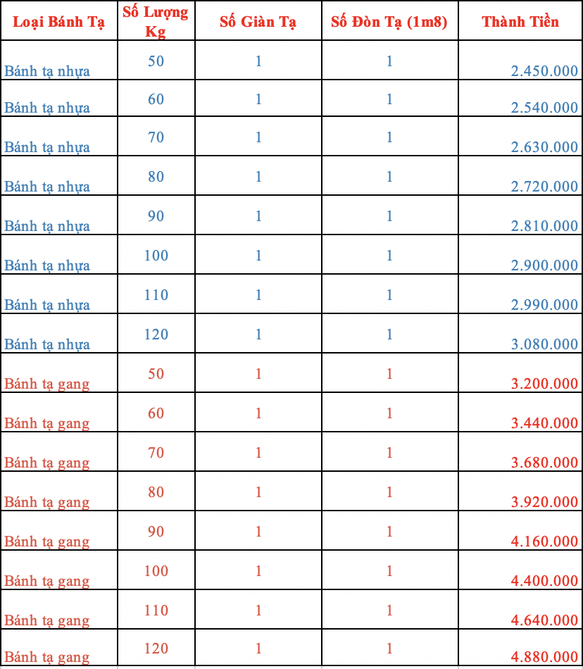- Lưu ý, giá bán trên chưa bao gồm đòn tạ và bánh tạ, để sử dụng thì bạn cần phải mua thêm bánh tạ + đòn tạ. Với bộ ghế tạ này thì bạn mua thêm 1 đòn tạ đẩy dài 1.5m có giá 290.000 đồng và bánh tạ nhựa giá 9.000 đồng/kg hoặc bánh tạ gang giá 27.000 đồng/kg, đòn tạ 1m8 giá 320.000 đồng. Sau đây là bảng giá chi tiết bộ ghế tập tạ đa năng Xuki 2020 đã bao gồm đòn tạ và bánh tạ.
