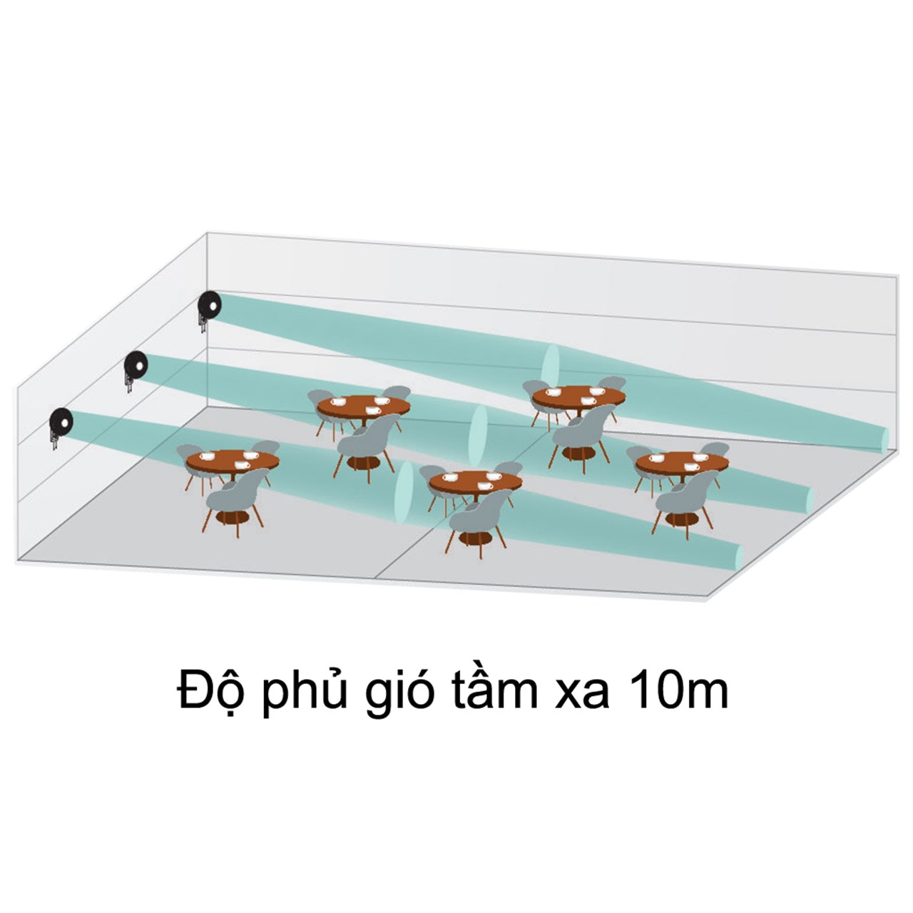 Quạt treo tường giúp làm mát ở không gian rộng mà lại rất tiết kiệm diện tích. Hoạt động với công suất cao nhất 67W cho lưu lượng gió 105 m3/phút tạo ra luồng gió mạnh và tập trung, độ phủ gió khoảng 10m.