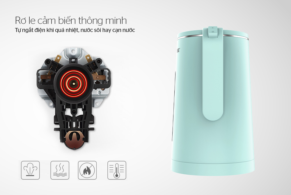 Ấm có chế độ ngắt tự động khi nước sôi hoặc cạn nước, đảm bảo an toàn tối đa cho người sử dụng.