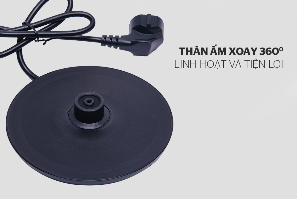 Bình được thiết kế với dáng đứng thon gọn, với tay cầm bằng nhựa cao cấp và cách nhiệt tốt giúp bạn yên tâm không bị nóng bỏng tay khi sử dụng ấm đang chứa nước sôi. Đặc biệt đế tiếp điện được thiết kế độc lập, tách rời khỏi thân ấm, giúp việc đổ nước – tiếp nước dễ dàng, linh hoạt. Bình có thể xoay 360 độ trên đế tiếp điện, người dùng có thể đặt ấm lên hay nhấc ấm ra khỏi đế ở bất cứ góc nào mà không phải lo lắng đến vấn đề phải đặt sao cho khớp.
