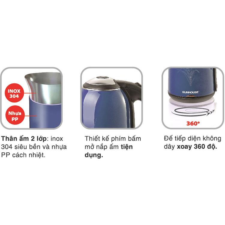 Bình Đun Siêu Tốc 2 Lớp Sunhouse SHD1382B với thiết kế trang nhã và màu sắc trang nhã với dung tích lớn 1.7 lít cùng công suất hoạt động cao 1800W giúp việc đun nước nhanh chóng hơn, tiết kiệm thời gian và điện năng tối đa.