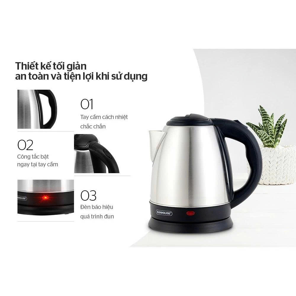 Ấm siêu tốc SUNHOUSE SHD1057 được thiết kế với dáng đứng thon gọn, tay cầm bằng nhựa cao cấp và cách nhiệt tốt giúp bạn yên tâm không bị nóng khi sử dụng ấm đang chứa nước sôi.