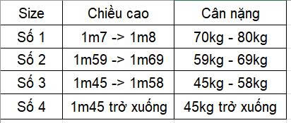 size 1 : 1m7 - 1m8 = 70kg - 80kg