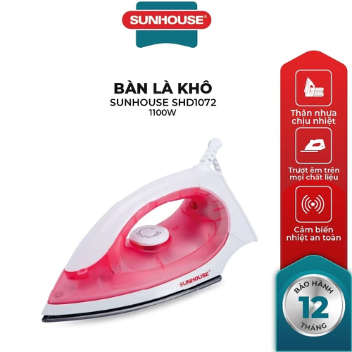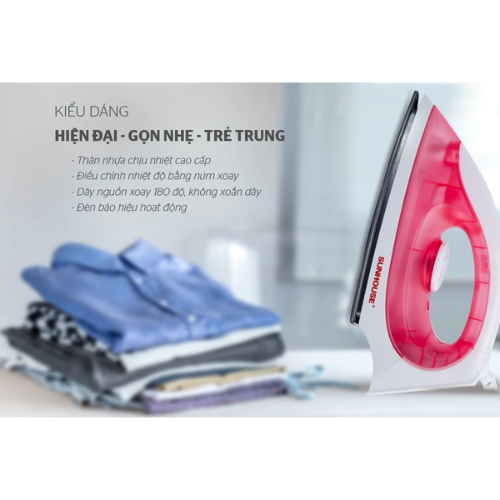 Bàn là khô SUNHOUSE là thiết bị gia dụng thiết yếu trong mỗi gia đình. Với công suất lớn dễ dàng điều chỉnh bằng núm xoay, mặt bàn là chống dính lướt êm trên mọi mặt vải, dây điện chắc chắn an toàn, sản phẩm có khả năng ủi là nhanh hơn hẳn so với bàn là thường, xóa nhanh các nếp nhăn quần áo mà không làm phai màu, giữ mùi thơm của quần áo lâu dài.