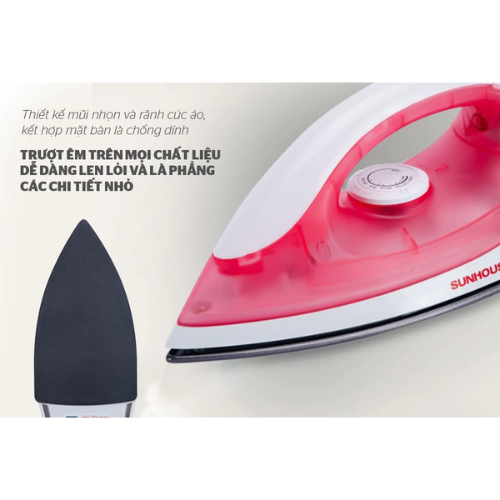 Bàn là khô SUNHOUSE màu trắng kết hợp với màu hồng trẻ trung, bắt mắt làm sinh động không gian sử dụng. Tay cầm thiết kế vừa vặn giúp người dùng ủi chắc chắn, không gây mỏi khi phải ủi nhiều và ủi lâu.