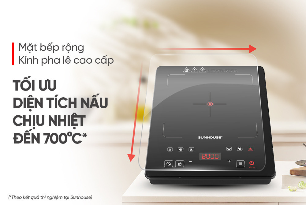 *Trong điều kiện thử nghiệm của Sunhouse, mặt kính Ceramic trên sản phẩm có khả năng chịu được mức nhiệt lên đến 700°C mà không bị nứt vỡ hay biến dạng. Khả năng này giúp bếp vận hành bền bỉ, an toàn khi sử dụng lâu dài trong gia đình.