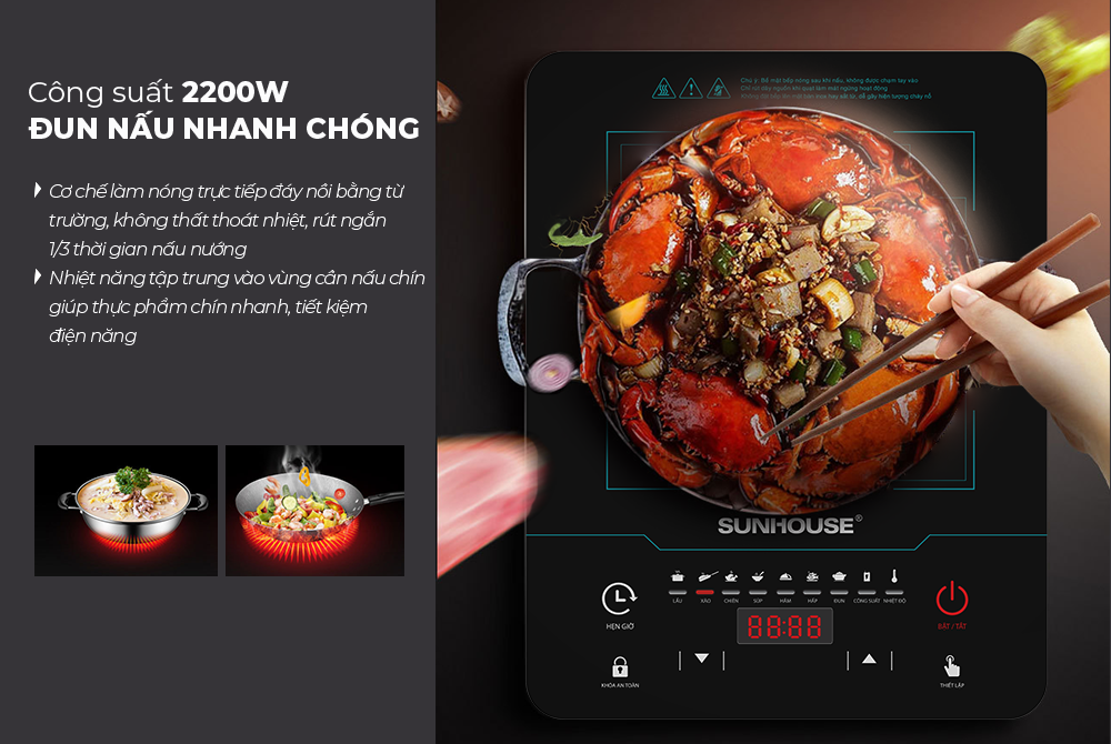 Bếp từ đơn SUNHOUSE SHD6879 có công suất cao 2200W giúp quá trình gia nhiệt diễn ra nhanh hơn. Cơ chế làm nóng trực tiếp đáy nồi bằng từ trường và nhiệt năng chỉ tập trung vào vùng cần nấu chín giúp thực phẩm chín nhanh, rút ngắn thời gian nấu nướng.