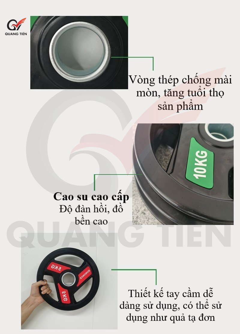 Chất liệu bánh tạ được đúc đặc từ vật liệu gang nguyên khối, bọc với cao su cao cấp, tạo độ đàn hồi và độ bền cực cao.