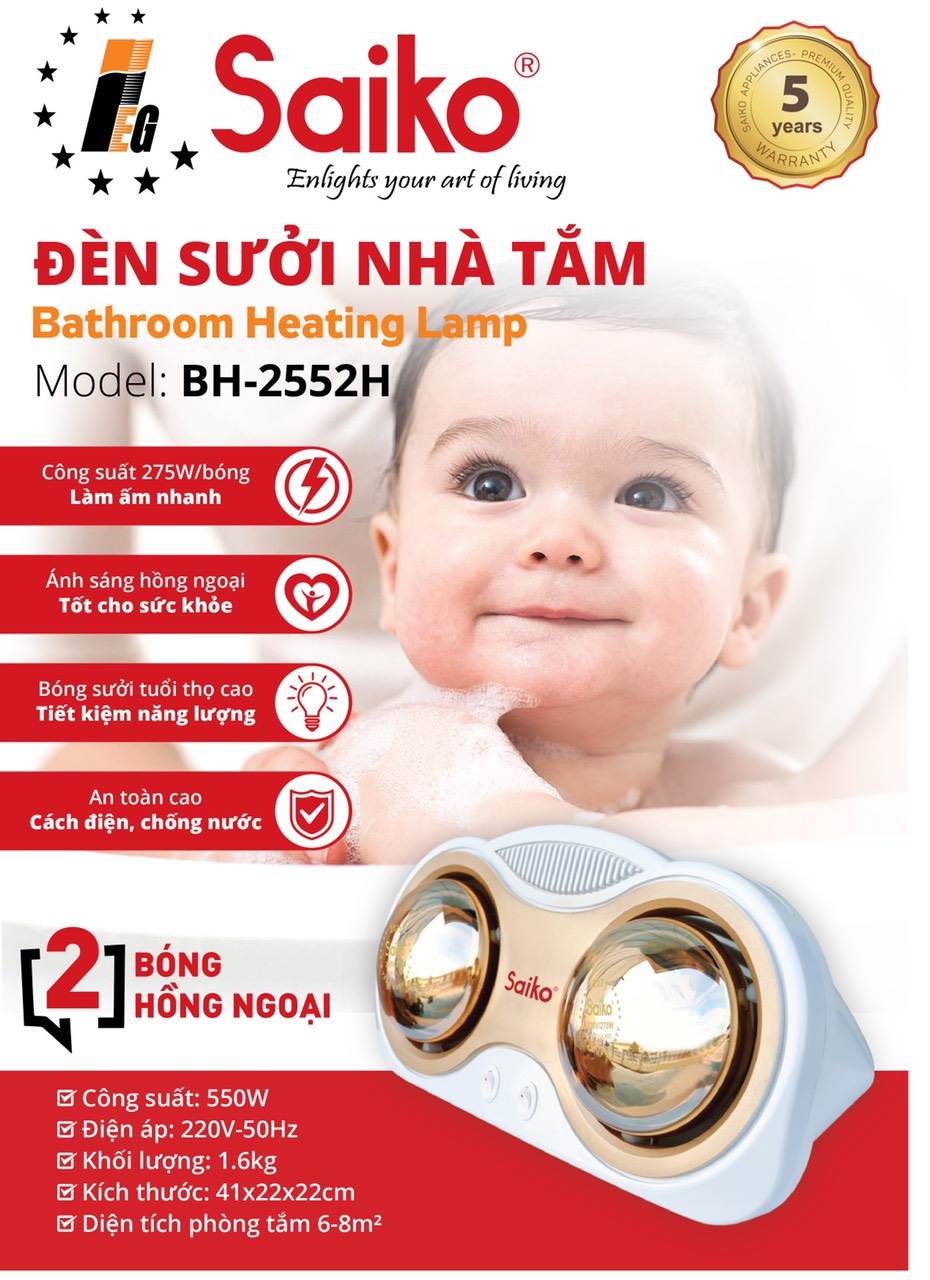 – Đèn sưởi nhà tắm Saiko hiện đang được xem là giải pháp an toàn và hoàn hảo nhất để trẻ luôn cảm thấy ấm áp mỗi khi tắm