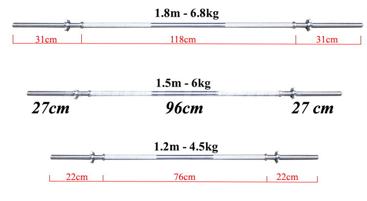 So sánh chiều dài , cân nặng của 3 loại đòn tạ gia đình là đòn 1,2m ; đòn 1,5 m ; đòn 1,8m .