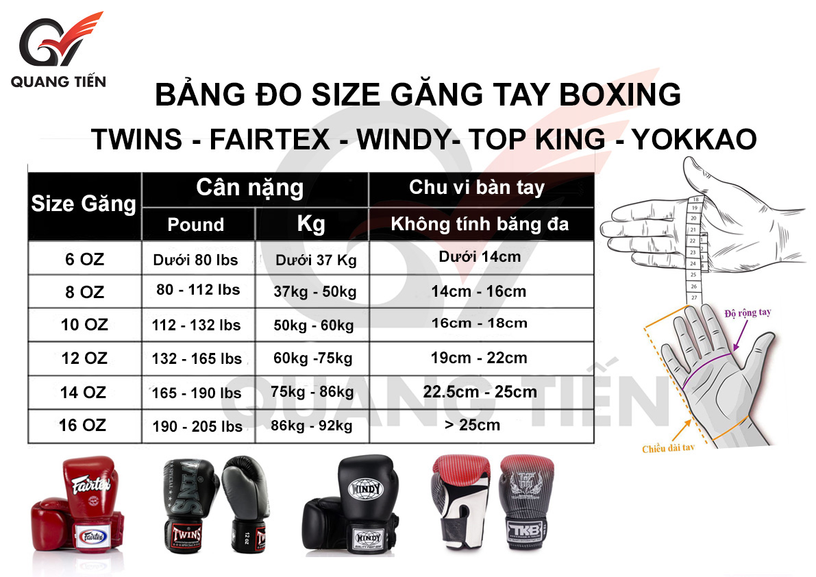 - Kích thước của găng: Găng boxing Twins cũng có nhiều kích thước khác nhau, phù hợp với từng kích thước bàn tay của người tập. Bạn nên chọn găng có kích thước vừa vặn với bàn tay của mình để đảm bảo sự thoải mái khi tập luyện.