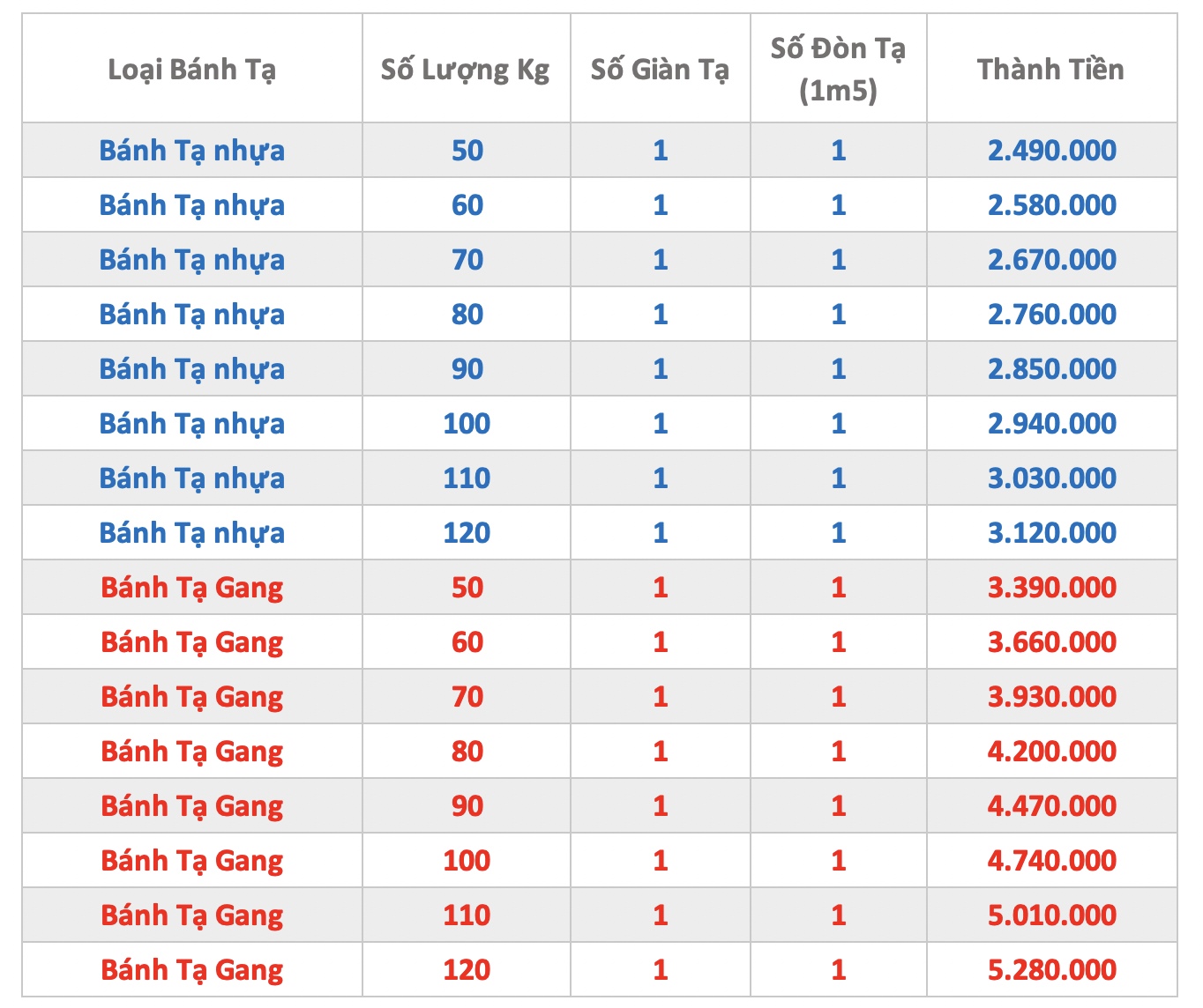 *** Lưu ý, giá bán trên chưa bao gồm đòn tạ và bánh tạ, để sử dụng thì bạn cần phải mua thêm bánh tạ + đòn tạ. Với bộ ghế tạ này thì bạn mua thêm 1 đòn tạ đẩy dài 1.5m có giá 290.000 đồng và bánh tạ nhựa giá 9.000 đồng/kg hoặc bánh tạ gang giá 27.000 đồng/kg, đòn tạ 1m8 giá 320.000 đồng. Sau đây là bảng giá chi tiết bộ ghế tập tạ đa năng Xuki đã bao gồm đòn tạ và bánh tạ:
