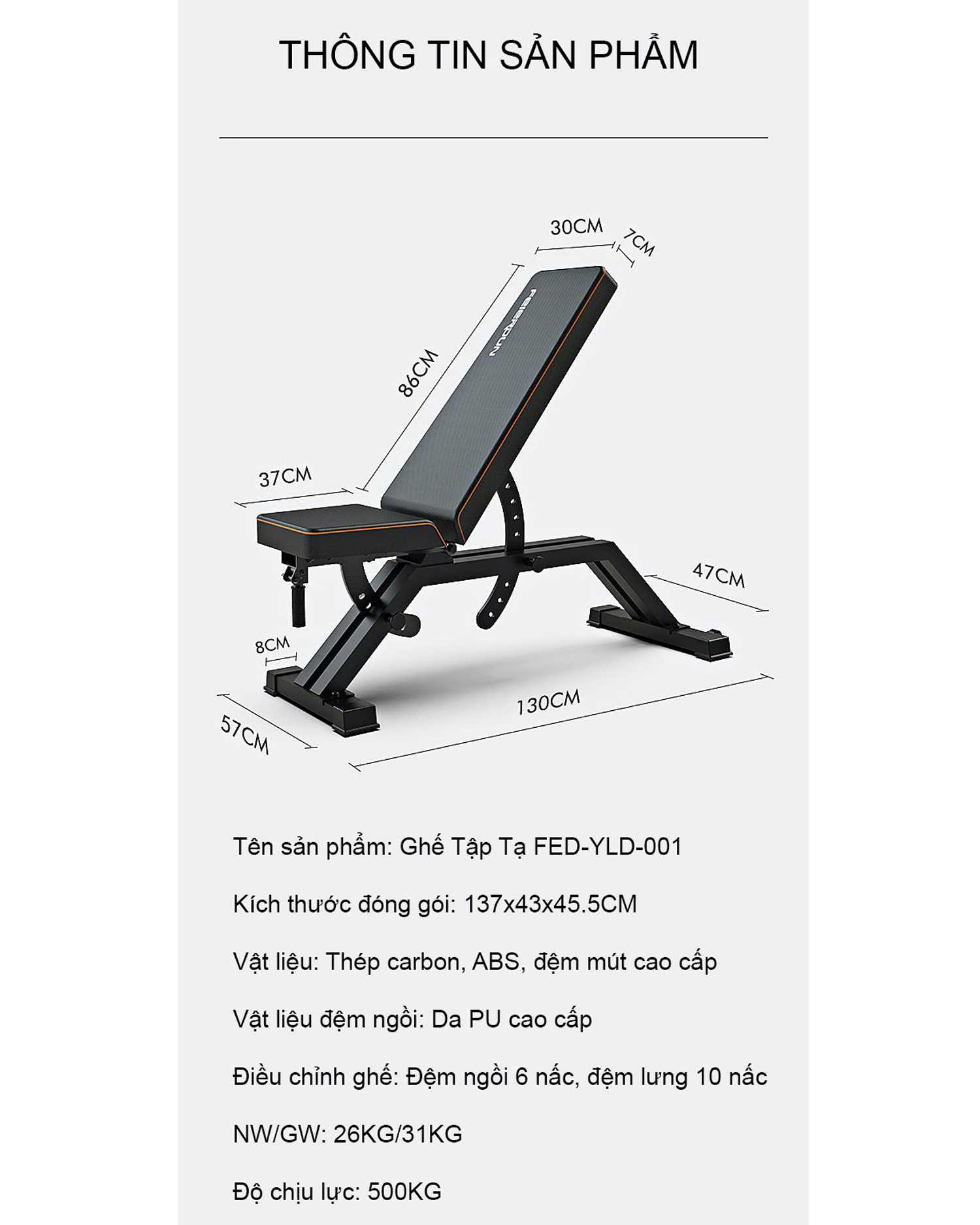 - Kích thước tổng thể của chiếc ghế tập tạ mới là 137 x 43 x 46 cm , kết cấu của nó được làm bằng thép carbon.