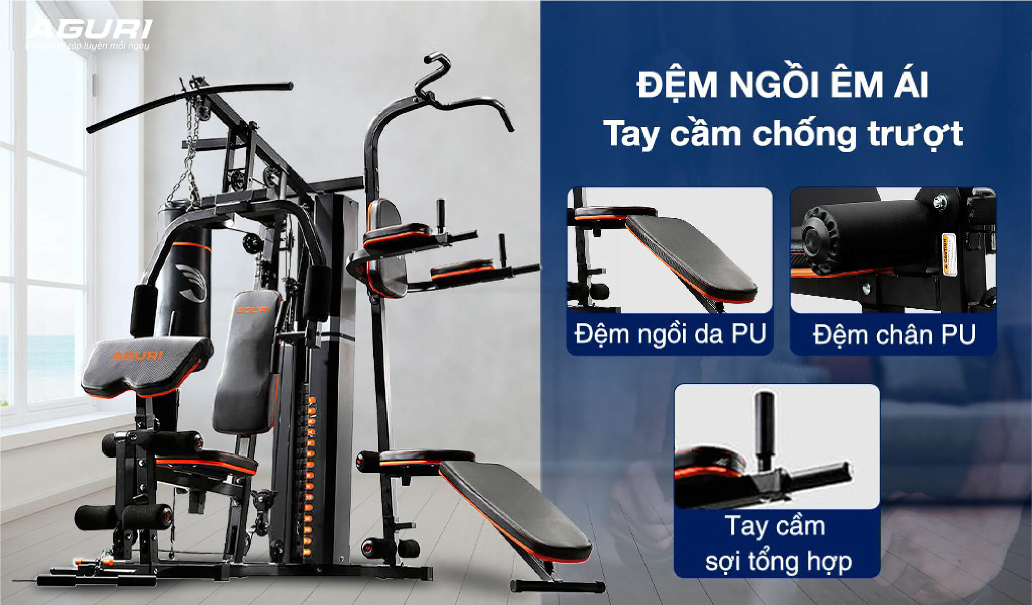 AGURI không chỉ là người bạn đồng hành tập luyện đáng tin cậy mà còn là nguồn cảm hứng động viên cho trải nghiệm tập luyện tối ưu và chất lượng vượt trội. Các thiết bị tập luyện của AGURI được thiết kế chuyên nghiệp và sở hữu kết cấu vững chắc, đảm bảo mang lại trải nghiệm tuyệt vời và an toàn cho người dùng.