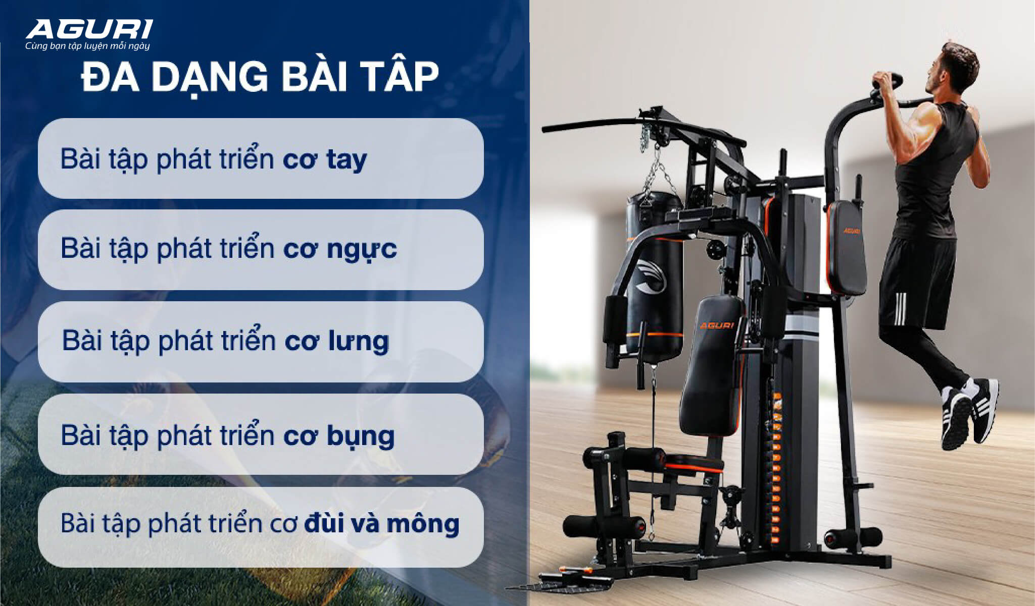 Sở hữu giàn tạ đa năng AGG-401 tại nhà, bạn có thể linh hoạt thay đổi tập luyện tối thiểu 8 bài tập, kết hợp với vận động toàn thân như: