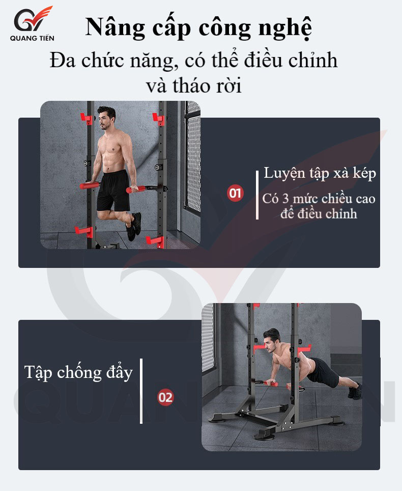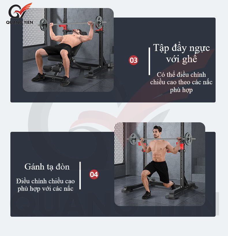 Sự linh hoạt trong điều chỉnh chiều cao khung tạ giúp người tập dễ dàng điều chỉnh, cân bằng được mức tập cũng như đa dạng hóa các bài tập như : Tạ đòn, squat, xà đơn, xà kép…