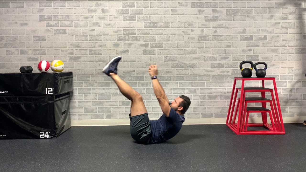 - Dùng cơ bụng từ từ nâng người và hai chân lên sao cho khuỷu tay chạm với đầu gối.