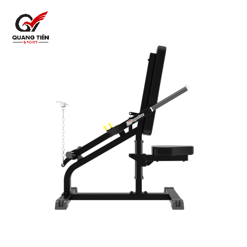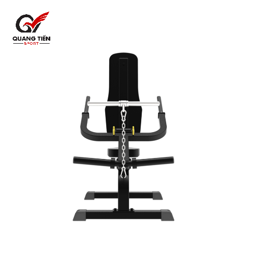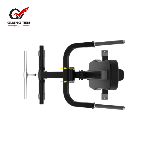 Mặt sau máy tập có tích hợp thêm phụ kiện thanh bar hỗ trợ tập tay trước. Phần thanh bar đi kèm với dây xích móc với khung máy nạp tạ để tăng độ khó cho bài tập.