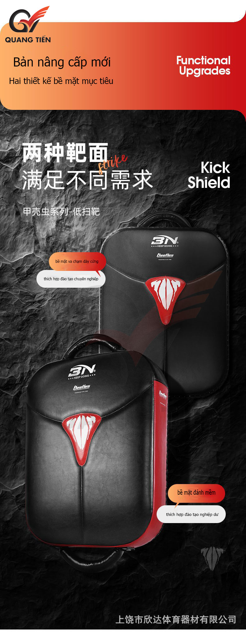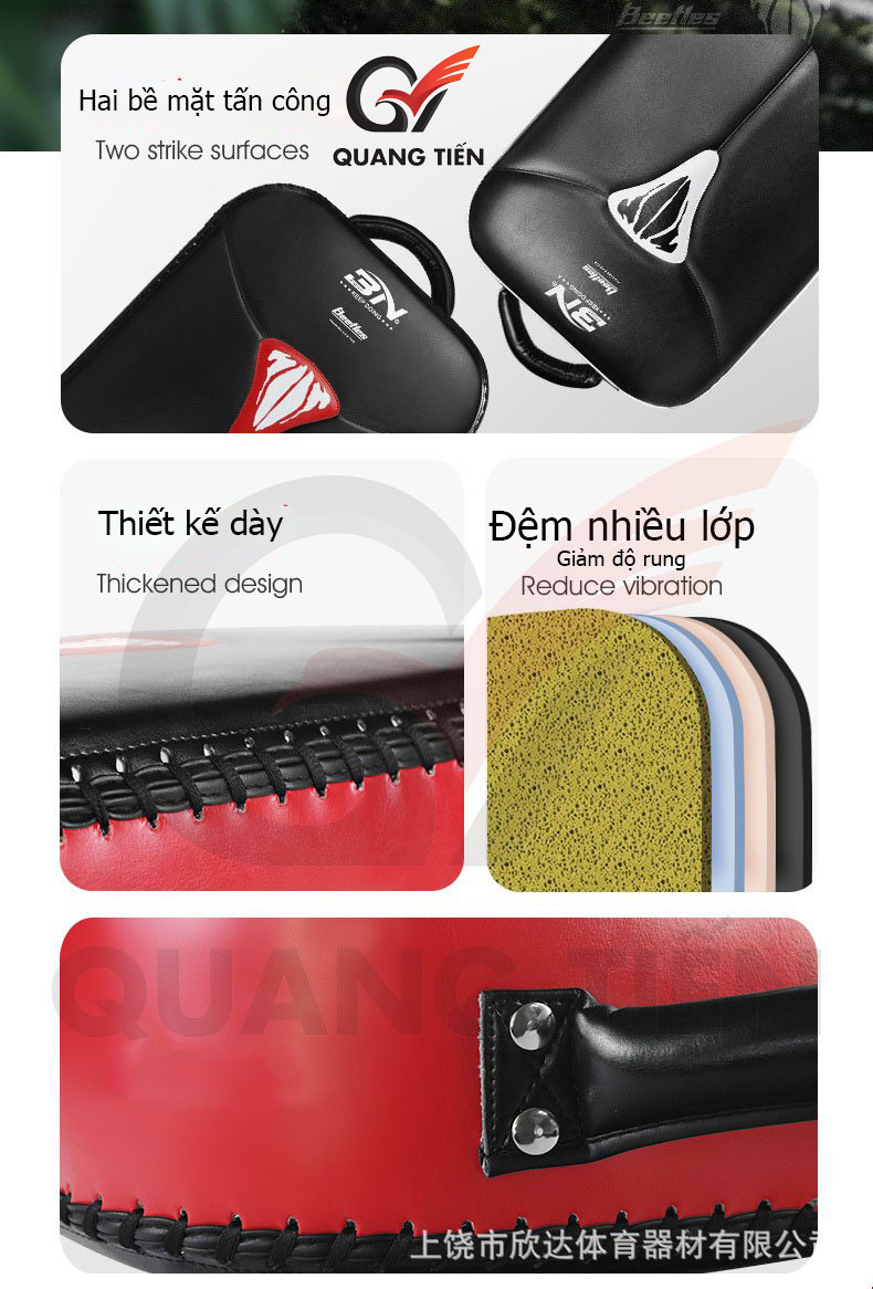 Sản phẩm khiên đá Muay Thai Kickboxing BN Fight được thiết kế cho các võ sĩ Muay Thai, Kickboxing, Tán Thủ..tập luyện chuyên sâu đòn đá chân. Với thiết kế lớp đệm foam dày 4 lớp hấp thụ lực đàn hồi tốt cung chất liệu da PU cao cấp. Thiết kế tay cầm linh hoạt với chi tiết tinh tán và chỉ khâu tỉ mỉ chắc chắn.