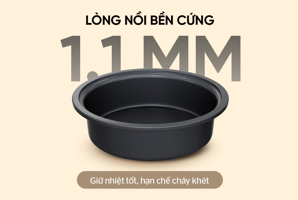 Lòng nồi bền cứng dày 1.1mm, giữ nhiệt tốt, hạn chế cháy khét
