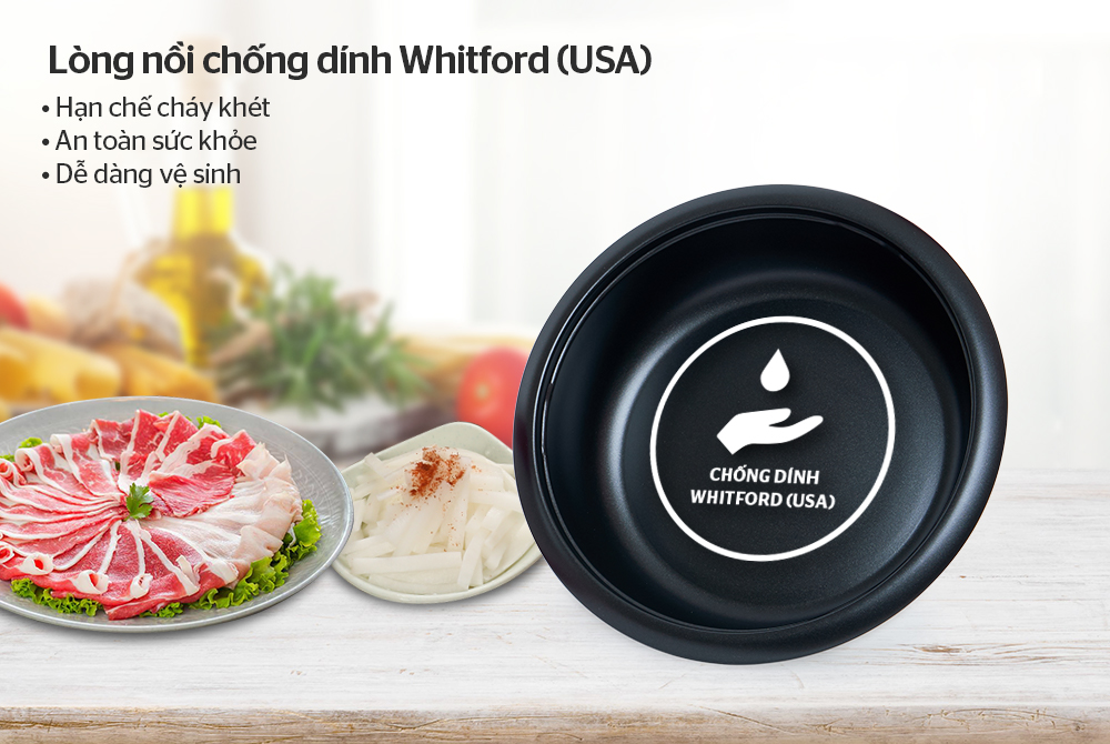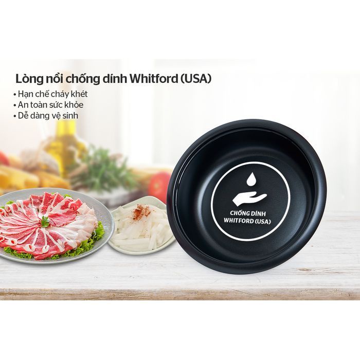 Lòng nồi được làm từ hợp kim nhôm dày giúp giữ nhiệt lâu hơn. Không những thế, lòng nồi còn được tráng một lớp chống dính Whitford (USA) siêu bền, không gây hại cho sức khỏe, tránh bám dính thức ăn và dễ dàng vệ sinh sau khi sử dụng.
