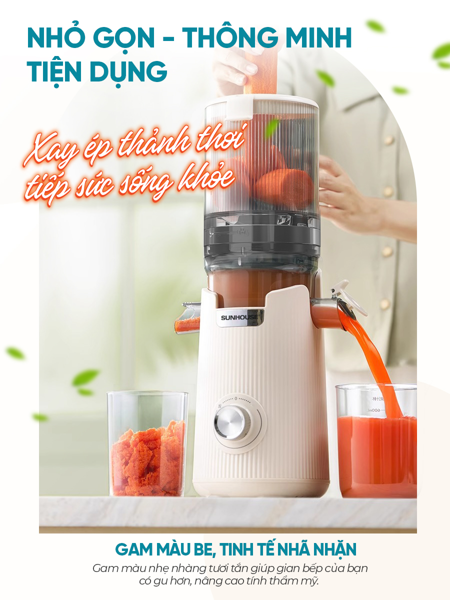 Máy ép chậm là một lựa chọn tuyệt vời cho những ai yêu thích thức uống từ trái cây và rau củ tươi. Thức uống từ trái cây cung cấp nhiều vitamin khoáng chất, các hợp chất thực vật và chất chống oxy hóa, giúp loại bỏ độc tố ra khỏi cơ thể. Máy ép chậm Sunhouse SHD5504, không chỉ ép mỗi hoa quả mà còn ép được các loại rau củ quả, tích hợp làm kem trái cây mát lạnh cho những ngày hè nóng nực.