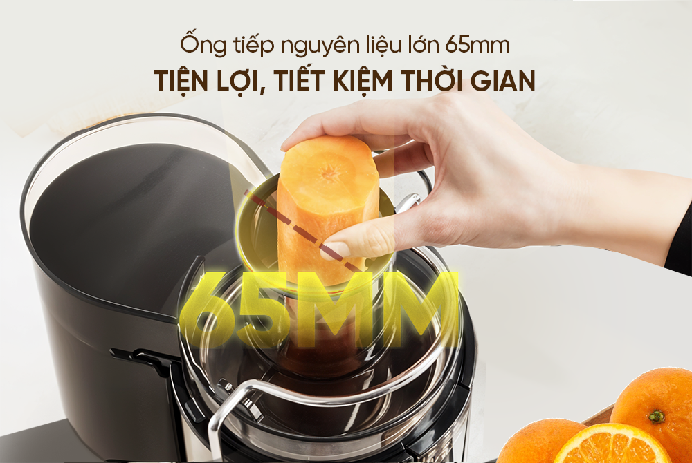 Với thiết kế ống tiếp nguyên liệu rộng lên đến 65mm, máy ép cho phép bạn cho cả trái cây nguyên quả hoặc miếng lớn vào mà không cần cắt nhỏ. Nhờ đó, quá trình sơ chế trở nên nhanh gọn hơn, giữ trọn dưỡng chất và tiết kiệm đáng kể thời gian chuẩn bị.