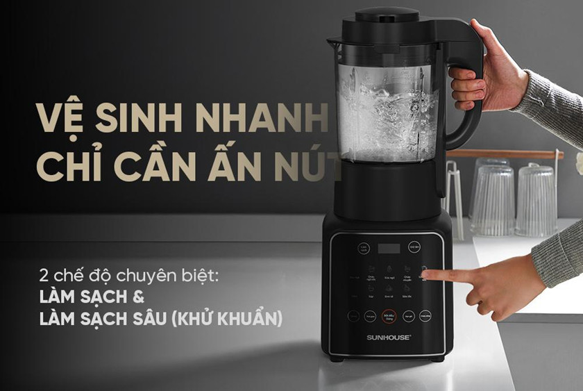 Không chỉ mạnh mẽ ở khả năng nấu và xay, Máy làm sữa hạt Sunhouse SHD5266 còn tích hợp chức năng tự làm sạch và khử khuẩn toàn diện. Sau khi sử dụng, chỉ với một thao tác bấm, máy sẽ tự động vận hành chế độ xoáy nước mạnh kết hợp gia nhiệt tiệt trùng, giúp làm sạch toàn bộ lưỡi dao, thành cối và nắp. Nhờ vậy, người dùng không chỉ tiết kiệm thời gian vệ sinh mà còn an tâm hơn khi các vết cặn bẩn, vi khuẩn hay mùi hôi đều được loại bỏ, đảm bảo an toàn vệ sinh cho những lần nấu tiếp theo.