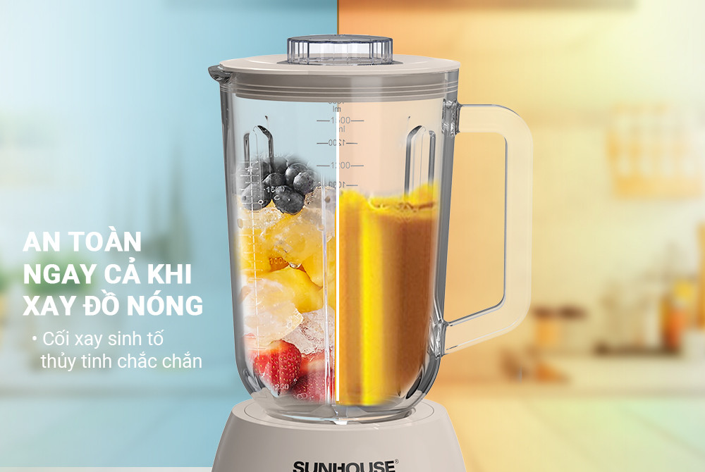 Cối xay sinh tố được làm từ thủy tinh chắc chắn, chịu được nhiệt độ cao, đảm bảo an toàn tuyệt đối ngay cả khi xay đồ nóng, không lo bị nứt vỡ.