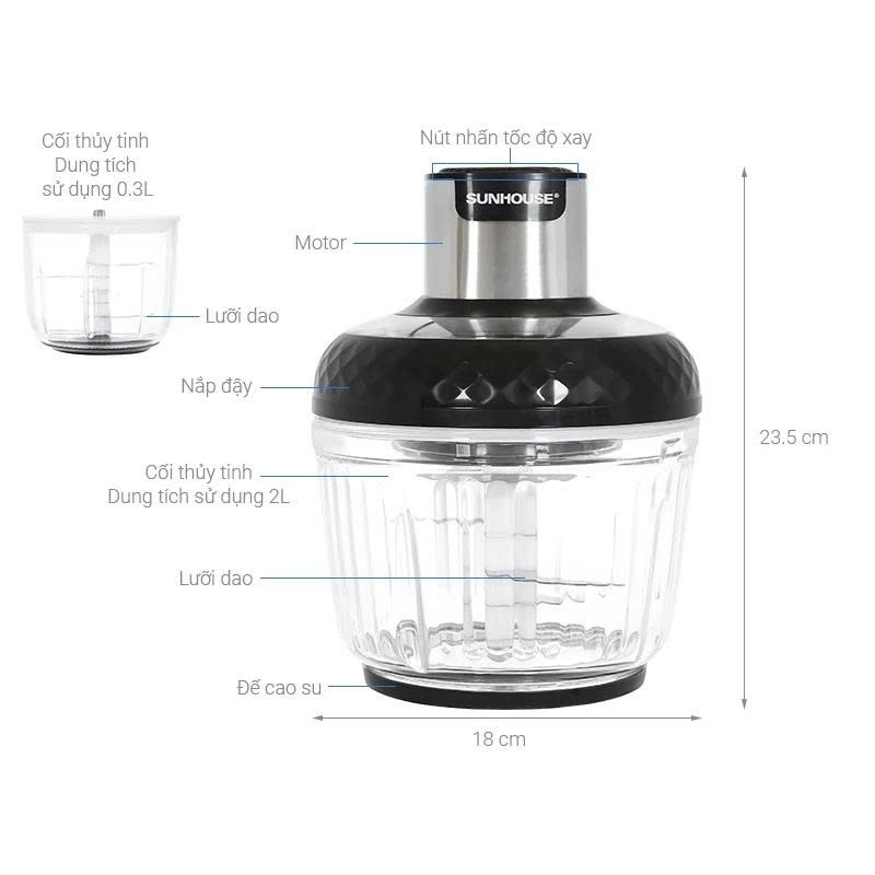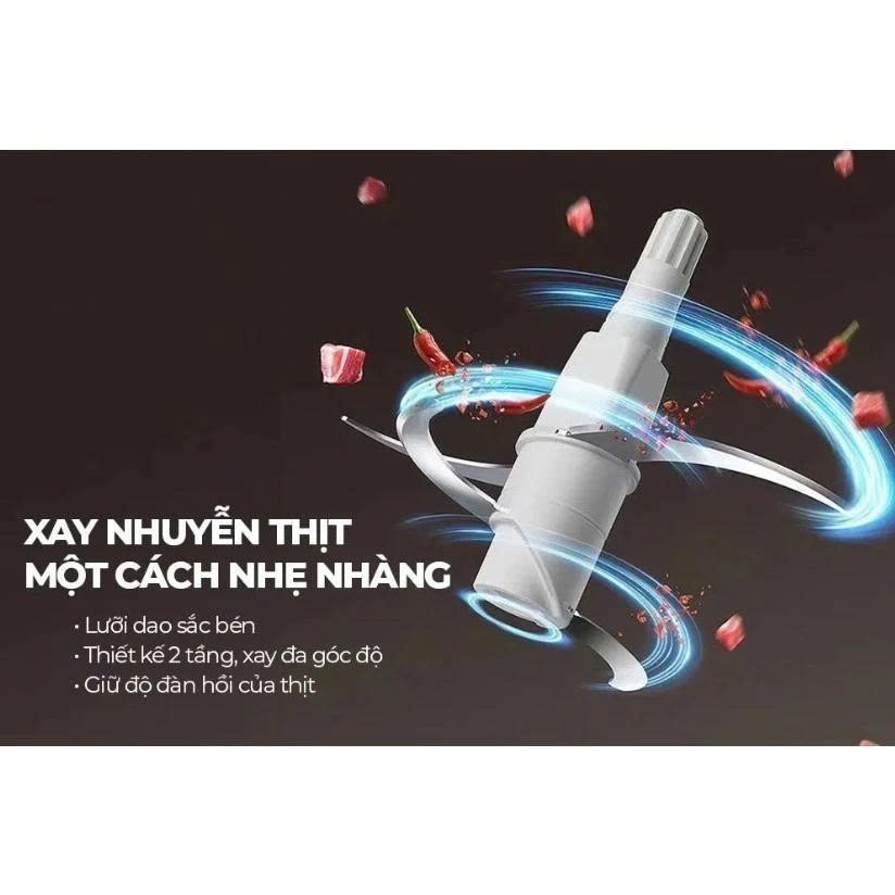Sản phẩm tích hợp 2 cối xay 2L và 0.3L giúp bạn linh hoạt xay nhuyễn nhiều loại thực phẩm khác nhau. Cối lớn 2L phù hợp xay thịt, cá. Cối nhỏ 0.3L thích hợp với các loại hạt thô, gia vị (hành, tỏi, sả, ớt…)