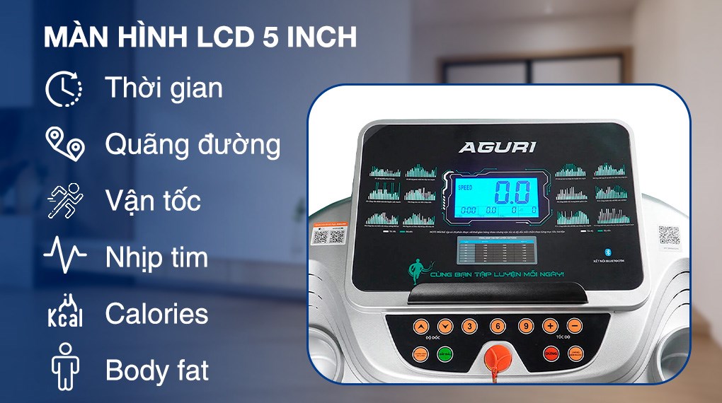 Máy chạy bộ AGT-115L sở hữu màn hình LCD 5 inch to đẹp, hiển thị rõ ràng các thông số về: Thời gian, quãng đường, vận tốc, nhịp tim, calories, body fat. Từ các thông số được hiển thị này, người dùng sẽ theo dõi để điều chỉnh cường độ tập phù hợp với thể trạng và cũng nhằm mang lại hiệu quả tập luyện tốt nhất. Các thông số hiển thị rõ ràng nên rất thân thiện với mắt.