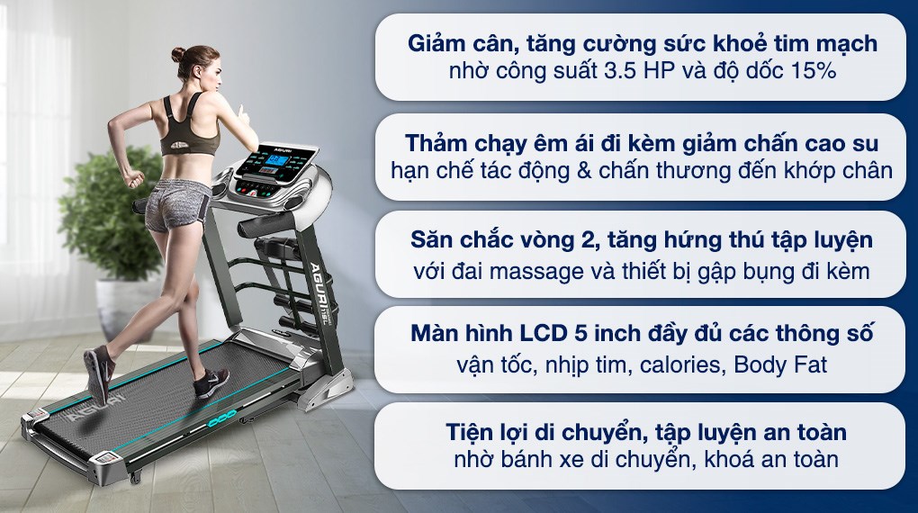 Giảm cân, tăng cường sức khỏe tim mạch: Nhờ công suất 3.5 HP và độ dốc 15%.