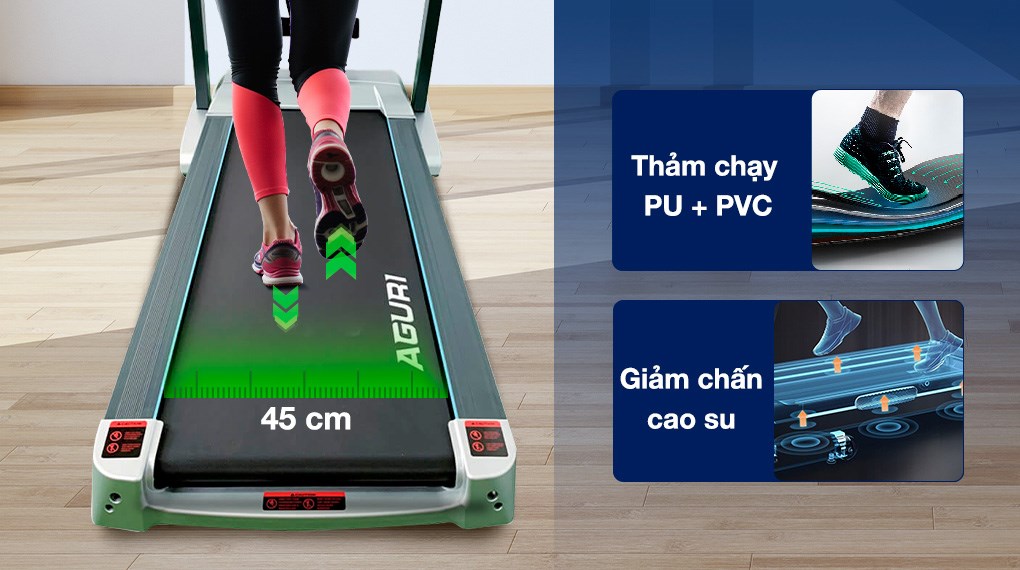 Thảm chạy của máy chạy bộ AGT-115L êm ái đi kèm giảm chấn cao su hạn chế tác động và chấn thương đến các khớp.