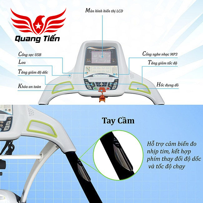 + Bảng điều khiển thiết kế trực quan, dễ nhìn và dễ dàng sử dụng các chức năng đi kèm. Bảng điều khiển tích hợp màn hình LCD 6 inch có chức năng thống kê, hiển thị các thông số trong quá trình tập gồm thời gian, vận tốc, quãng đường, lượng calo tiêu hao, nhịp tim và chương trình tập luyện. Ngoài ra, trên bảng điều khiển còn tích hợp phím bấm Start/Stop, phím chọn tốc độ, độ dốc, loa nghe nhạc, cổng nghe nhạc mp3, cổng USB để sạc và hộc để đồ dùng cá nhân...
