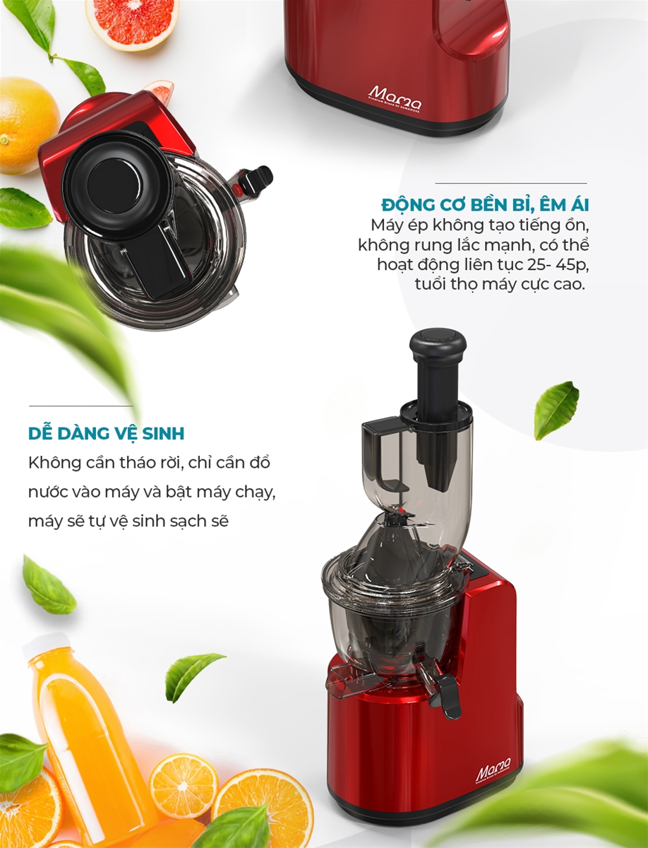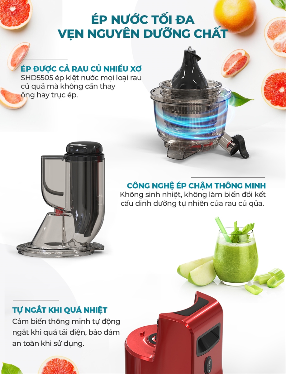 Công nghệ ép chậm thông minh với tốc độ 50 vòng/phút giúp ép nước tối đa, giữ trọn vitamin & hương vị tự nhiên.