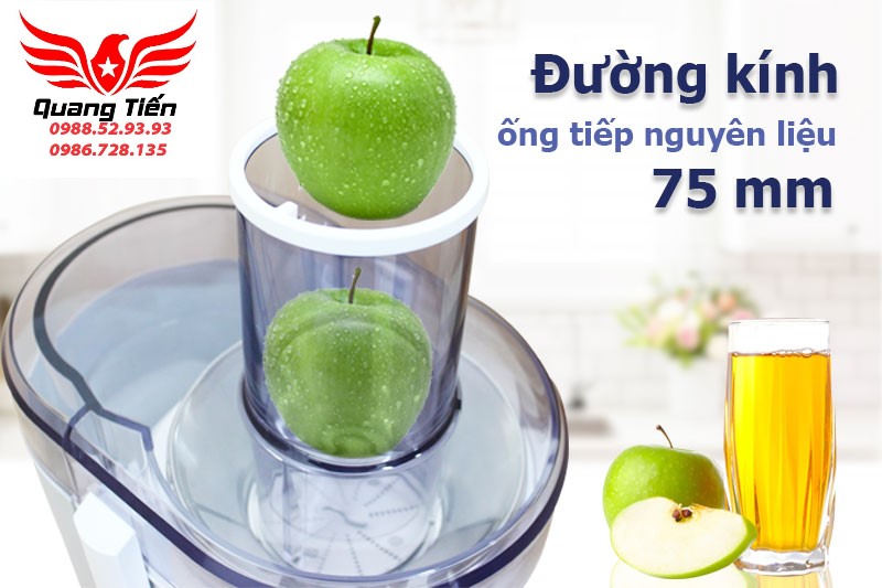 Máy ép trái cây có ống tiếp nguyên liệu có đường kính lớn giúp bạn ép trái cây mà không cần cắt nhỏ