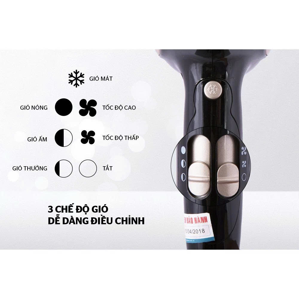 Sản phẩm sử dụng nút gạt lên xuống để thay đổi 2 tốc độ gió & 3 mức nhiệt. Chế độ gió nóng mặc định, nếu muối đổi chế độ gió mát, bạn chỉ cần ấn nút có sẵn trên tay cầm.
