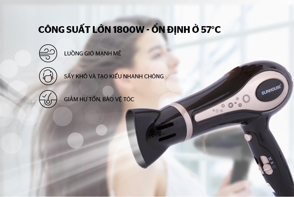 Máy sấy tóc SUNHOUSE SHD2317 công suất lớn lên đến 1800W giúp tóc nhanh khô. Sản phẩm còn có đầu sấy hẹp tạo luồng khí mạnh và tập trung giúp bạn làm khô tóc nhanh chóng và tạo được nhiều kiểu tóc hơn.