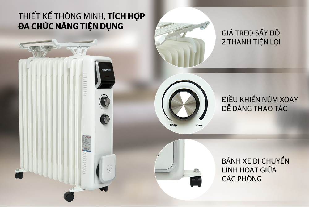 Máy sưởi dầu 13 lá SUNHOUSE SHD7084 có kiểu dáng sang trọng với màu trắng chủ đạo, đi kèm là những chức năng hiện đại, thuận tiện cho người sử dụng. Sản phẩm kèm theo tay kéo, bánh xe và ổ cuốn dây điện nên rất tiện di chuyển và bảo quản tại nhà.