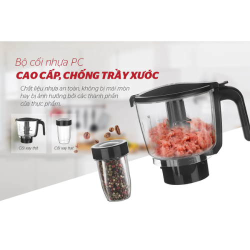Đi kèm với sản phẩm là một cối nhựa để xay các loại ngũ cốc, hạt khô (cà phê, tiêu, lạc.. và một cối xay cỡ vừa chuyên để xay các loại thịt, cá tôm…