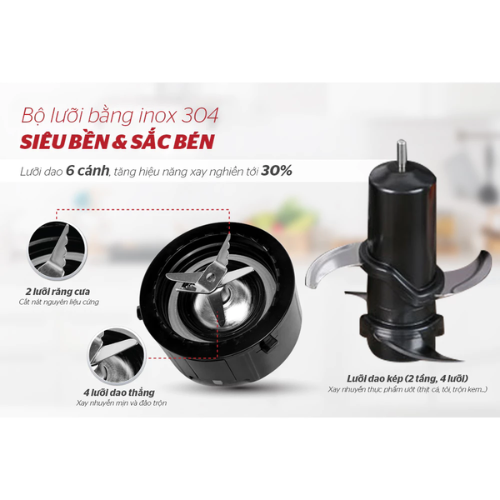 Mỗi cối xay của máy đều được trang bị 1 lưỡi dao inox sắc bén, siêu bền, không han gỉ, xay nhuyễn được nhiều loại nguyên liệu khác nhau.