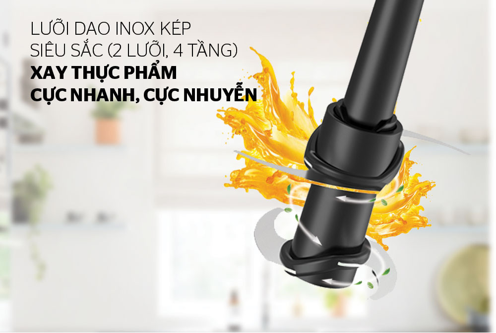 Được trang bị lưỡi dao xay bằng inox sắc bén, thiết kế kép (2 tầng, 4 lưỡi) giúp xay thực phẩm cực nhanh, cực nhuyễn so với máy xay thông thường.
