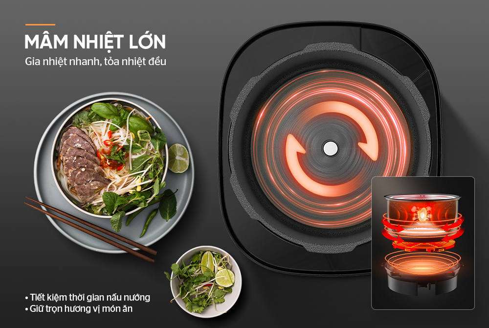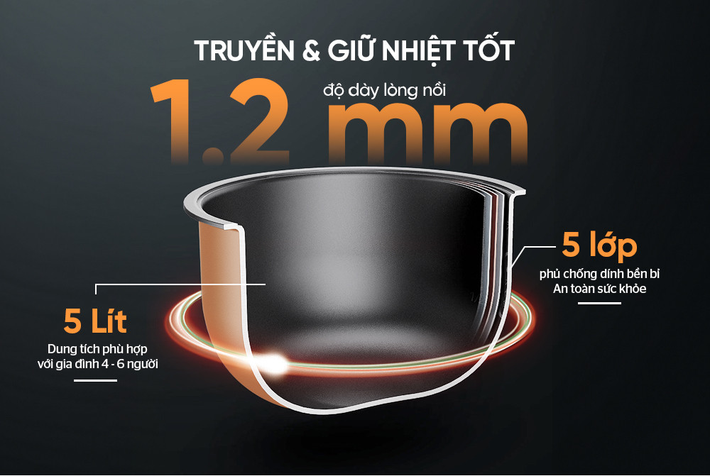 Lòng nồi bằng hợp kim nhôm dày 5 lớp giúp cho nhiệt lượng bên trong tỏa đều hơn, tuần hoàn 4 phía chứ không chỉ từ mâm nhiệt phía dưới phát lên. Nhờ đó, thực phẩm được ninh đều, chín nhanh hơn và cũng mềm thơm hơn; đối với cơm thì hạt chín đều, không lo cơm sống ở bề mặt còn đáy nồi thì cháy khét.