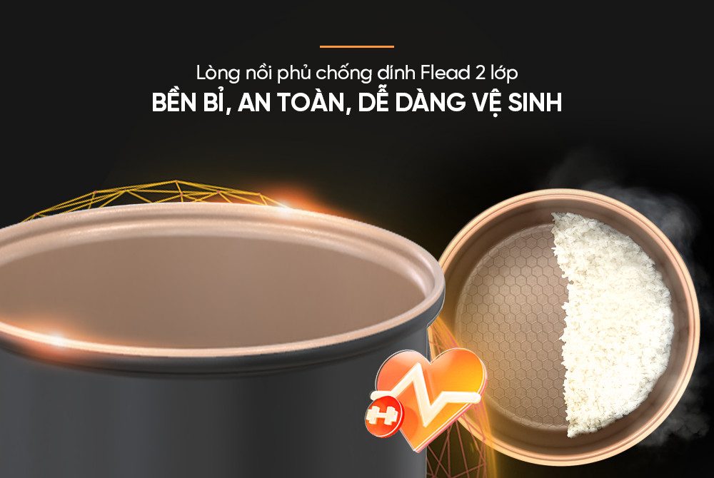 Lớp chống dính Flead 2 lớp siêu bền, hạn chế bong tróc, tránh bám dính cơm ở đáy nồi giúp cho việc vệ sinh trở nên nhanh chóng hơn.