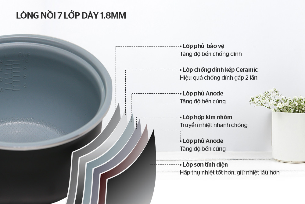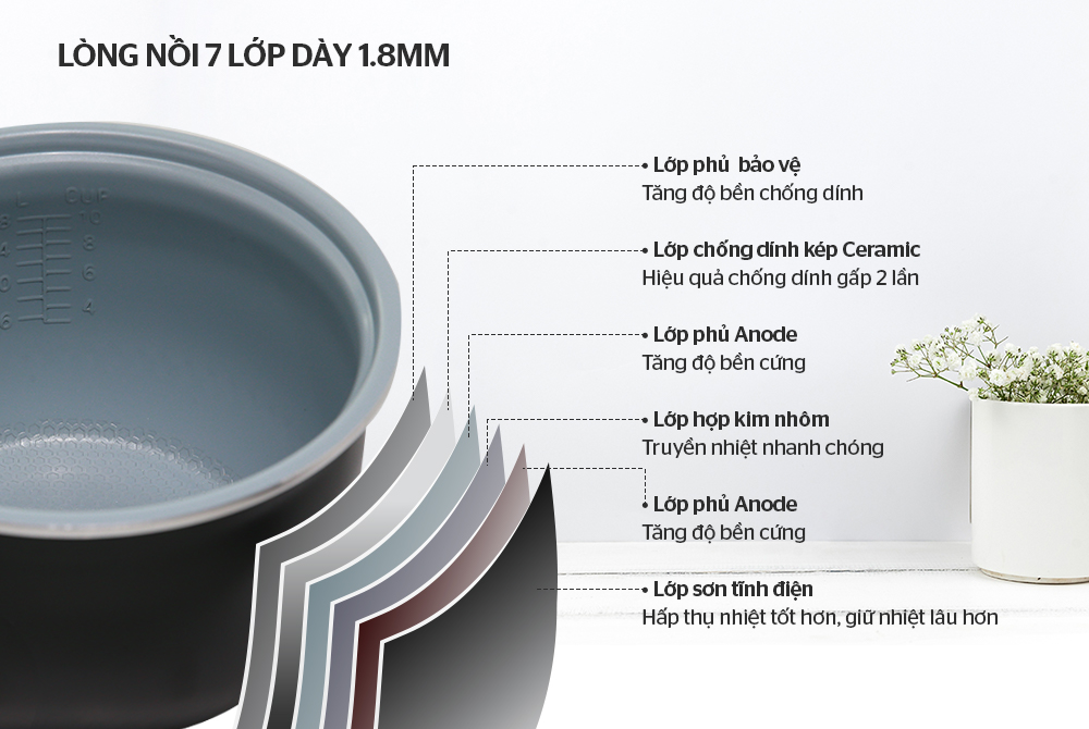 Lòng nồi 7 lớp dày 1.8mm, phủ chống dính kép Ceramic