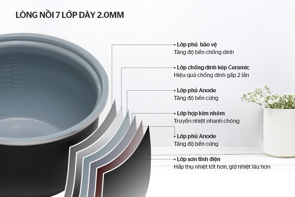Lòng nồi làm từ hợp kim nhôm dạng niêu đặc biệt và dày tới 2.0mm. Trong đó có 2 lớp phủ anode – đây là chất liệu có độ bền cứng rất cao, hạn chế móp méo nếu chẳng may xảy ra va đập. Lòng nồi cơm điện càng dày thì càng giữ nhiệt tốt hơn, cơm ngon lâu hơn, hương vị được giữ trọn vẹn.