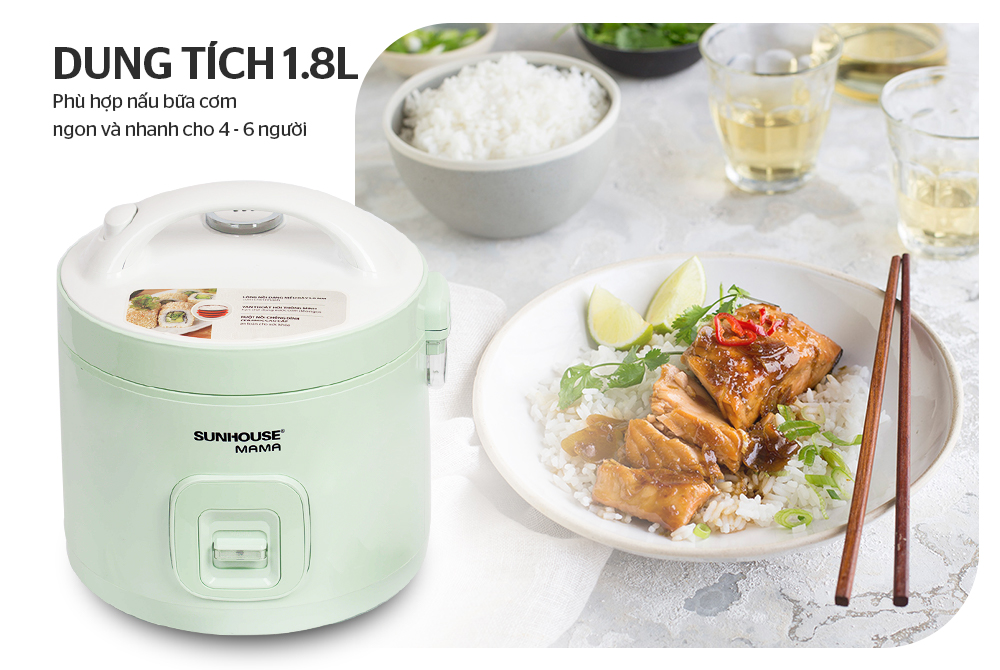 Với lòng nồi dạng niêu và công suất 700W, nồi cơm điện 1.8L SUNHOUSE MAMA SHD8665B sẽ cho món cơm chín đều, mềm và ngon hơn. Dung tích 1.8L phù hợp với gia đình 4 – 6 người.