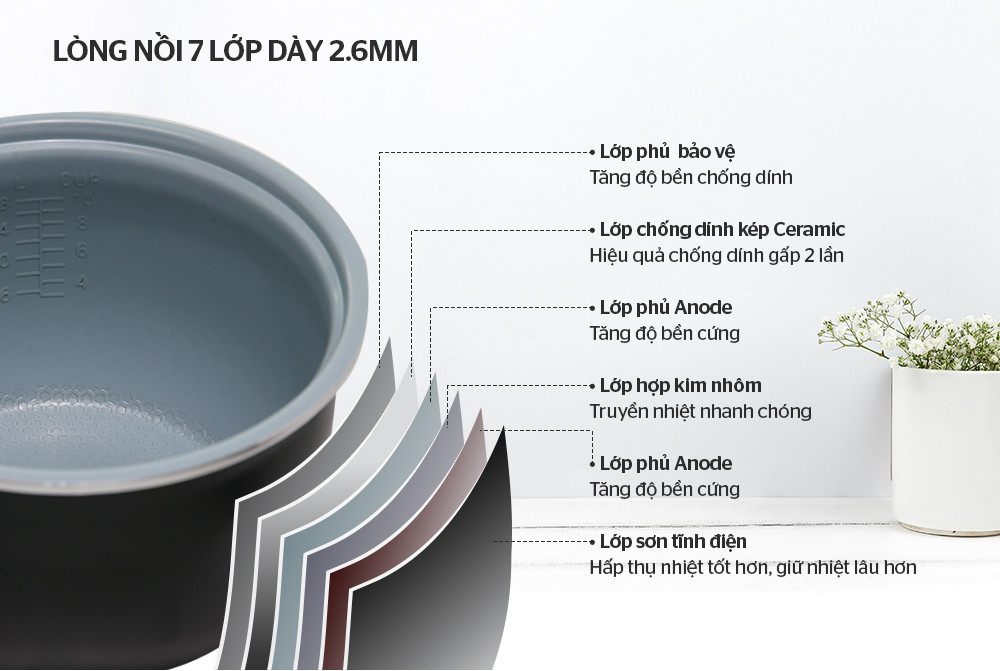 Lòng nồi 7 lớp dày 2.0mm, phủ chống dính kép Ceramic