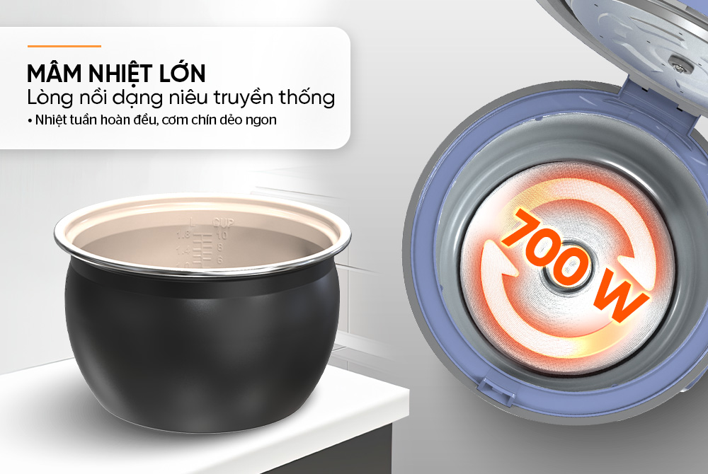 Dung tích 1.8L phù hợp với gia đình 4 – 6 thành viên.
