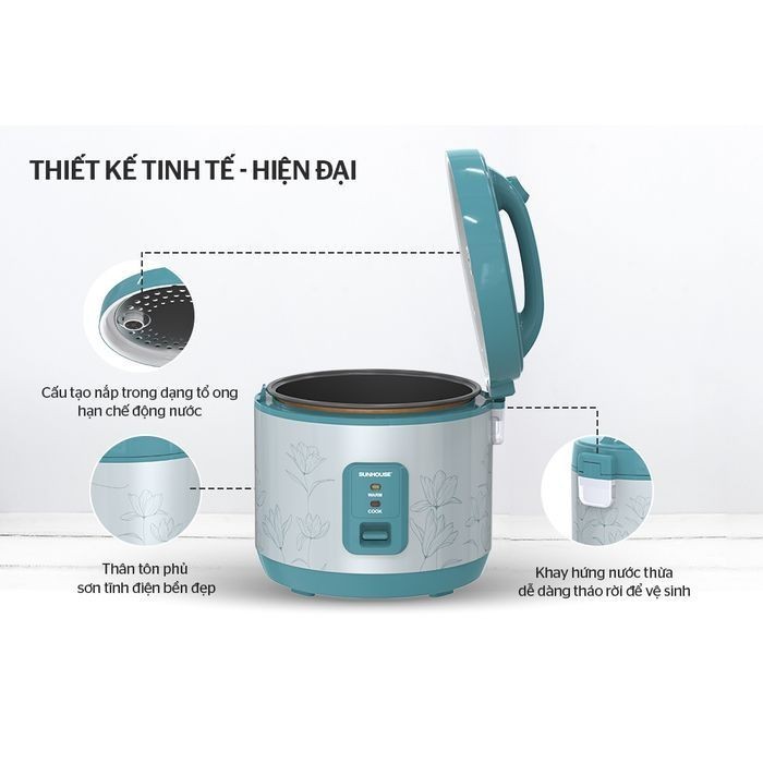 Nồi cơm điện SUNHOUSE SHD8605 có thiết kế đơn giản, màu sắc hài hòa với họa tiết hiện đại, tạo cảm hứng nấu nướng cho người nội trợ và tô điểm thêm cho gian bếp.